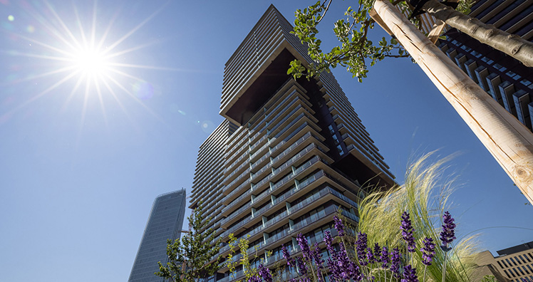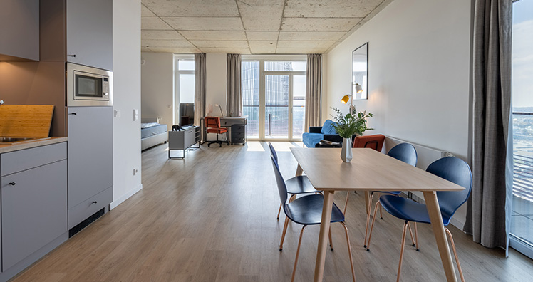 Einzigartig ist auch das Rooftop in der 35. Etage, das nicht nur eine Disco und eine weitere Community-Kitchen für die Bewohner*innen bereithält, sondern auch eine weitläufige Terrasse, die einen 360-Grad-Blick über die Stadt ermöglicht. Community- und Management-Services vor Ort runden das vielfältige Angebot ab. Weitere Highlights für die Bewohner*innen sind ein Fit/One Studio auf über 2.500 m² und ein TREBLE Gastronomiekonzept, welche direkt im Haus eröffnen werden.