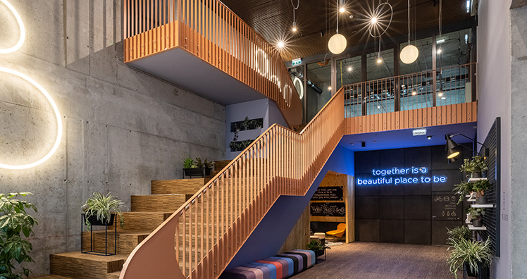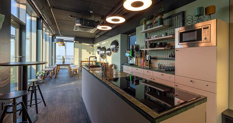 Das Haus besticht neben seiner außergewöhnlichen Architektur und dem sensationellen Ausblick auf die Stadt durch eine Vielzahl an hochwertigen Services: das Angebot reicht von Community-, Working- und Chillout-Lounges, über ein Cinema, eine Gaming-Lounge bis hin zu einer Community-Kitchen.