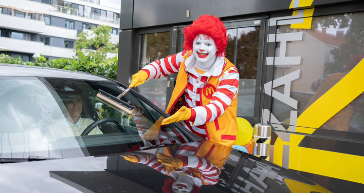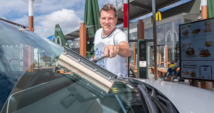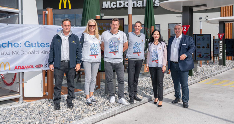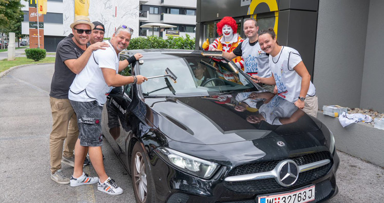 Vergangenen Freitag ging der österreichweite "McDonald's Car Wash Day 2021" über die Bühne: Zahlreiche Restaurantmitarbeiter:innen und Franchisenehmer:innen stellten sich an insgesamt 105 McDrives in den Dienst der guten Sache. Gemeinsam mit prominenter Unterstützung von Fußball-Legende Andi Herzog, der Kult-Band Wiener Wahnsinn, der Show- und Cheerdance-Gruppe Milleniumdancers und weiterer lokaler Prominenz aus den Bereichen Politik, Sport und Kultur wurde beherzt zu Schwamm und Kübel gegriffen, um die Windschutzscheiben der McDrive-Gäste gegen eine freiwillige Spende zum Glänzen zu bringen.