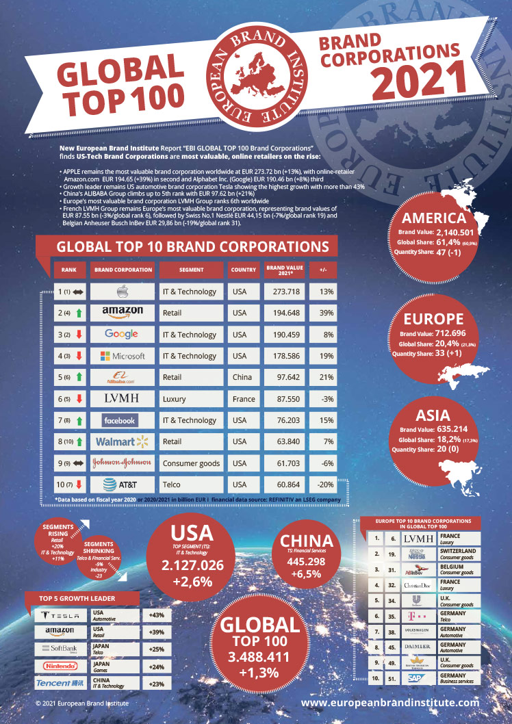 Das "Global Top 100 Brand Corporations Ranking" des European Brand Institutes hat mehr als 3.000 Markenunternehmen und deren Marken in 16 Branchen, basierend auf aktuellsten ISO Standards analysiert. Die Daten basieren auf dem Geschäftsjahr 2020 bzw. 2020/2021.