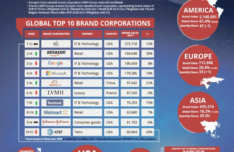 Apple bleibt mit über 273 Milliarden Euro und einem Wachstum von 13 Prozent der wertvollste Markenkonzern weltweit, während der Online-Händler Amazon.com mit 194 Milliarden Euro und einem beachtlichen Wachstum von 39 Prozent an zweiter Stelle liegt. Der Internet-Riese Google (Alphabet Inc.) residiert mit EUR 190 Milliarden Euro (+8 Prozent) auf Rang drei.