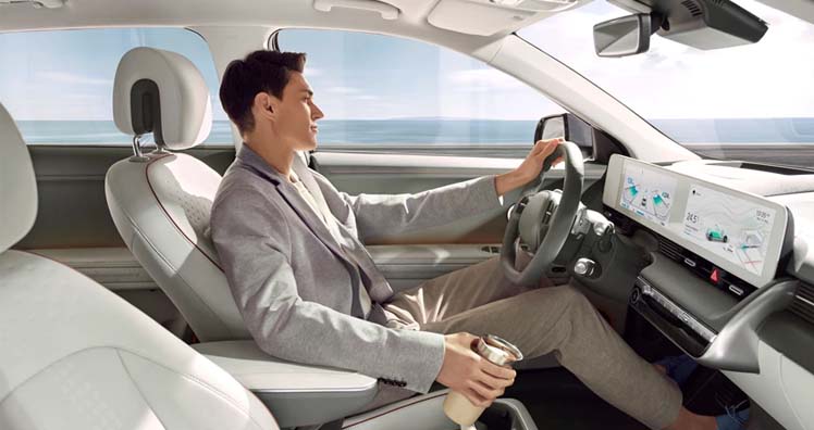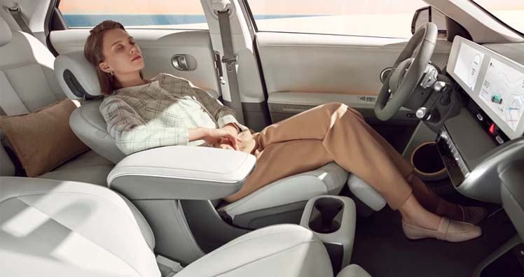 Im Interieur des IONIQ 5 verschwimmen die Grenzen zwischen Wohn- und Fahrgastraum. Ein ebener Boden, außergewöhnlich einstellbare Vordersitze, die sich vollständig umlegen lassen und eine flexible Mittelkonsole, die bis zu 144 mm verschiebbar ist, sorgen für ein außergewöhnliches Erlebnis. Das optionale Panoramadach des IONIQ 5 verleiht dem Innenraum ein Gefühl von Offenheit, da der Dachhimmel des IONIQ 5 aus einer einzigen großen Glasfläche ganz ohne Stützmaterialien besteht.