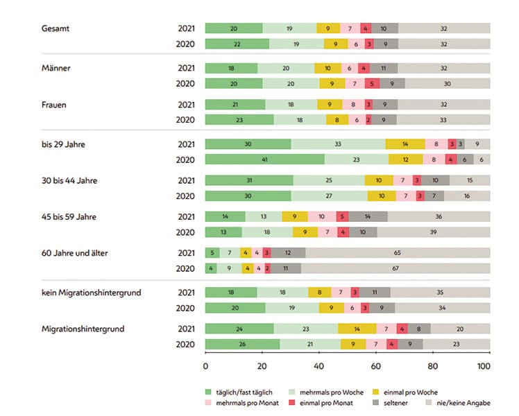 Die junge Generation sind aber auch in der Kategorie Streamingdienste (wie Netflix) für eine Überraschung gut: Hier ging der tägliche Konsum von 41 Prozent im Vorjahr sogar auf 30 Prozent zurück.