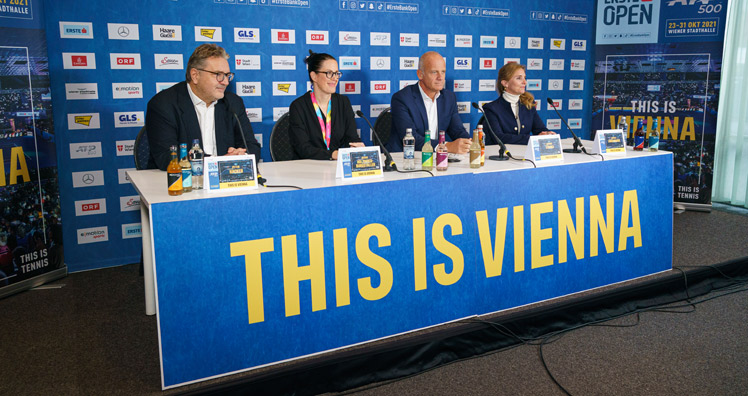 Turnierdirektor Herwig Straka, Erste-Bank-CEO Gerda Holzinger-Burgstaller, Sport- und Gesundheits-Stadtrat Peter Hacker sowie Wiener-Stadthalle-Geschäftsführerin Carola Lindenbauer zogen am Sonntag eine mehr als zufriedene Bilanz über die "Erste Bank Open 2021". Durch die 2G-Regelung gab es in der Wiener Stadthalle im Gegensatz zum Vorjahr keine Besucherbeschränkungen. Insgesamt kamen fast 60.000 Zuschauer:innen in die Stadthalle und den neuen, zweiten Standort "Tennis 2 Go" am Gelände des Wiener Eislauf-Vereins am Heumarkt.