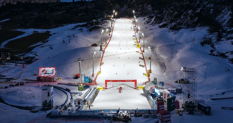 Entlang der 375m langen Piste wurden zwölf Masten (sechs auf jeder Seite) positioniert, pro Mast 17 Altis LED-Fluter mit symmetrischer und asymmetrischer Lichtverteilung in 5700K und 3000K. Sie sind so platziert und ausgerichtet, dass die speziellen Optiken Streulicht in die Umwelt auf das Mindestmaß reduzieren. Die Anforderungen der Normen für Sportstätten und Vorgaben für Lichtimmissionen, sowie das Pflichtenheft des ORF werden erfüllt. Die flickerfreie Beleuchtung mit Altis gewährleistet, selbst bei Superzeitlupe, eine gleichbleibende Helligkeit. Der Steilhang mit einer Neigung von bis zu 27 Grad und die Geländekanten, die mit spektakulären Sprüngen bewältigt werden, erfordern eine fachgerechte punktgenau Einstellung. Außerhalb der Weltcup-Rennen wird die Piste als Trainingsstätte und als Ausbildungsplatz genutzt. Hierfür werden pro Mast lediglich vier der Fluter mit warmweißem Licht und individuell auf Minimalniveau gedimmt. Die Lichtsteuerung LITECOM von Zumtobel ermöglicht es mit einer intuitiven App das passende Lichtniveau für Publikumsskilauf, Nachwuchstraining und Wettkampf einzuschalten.