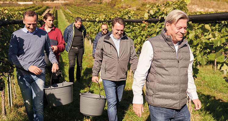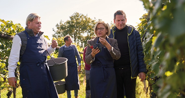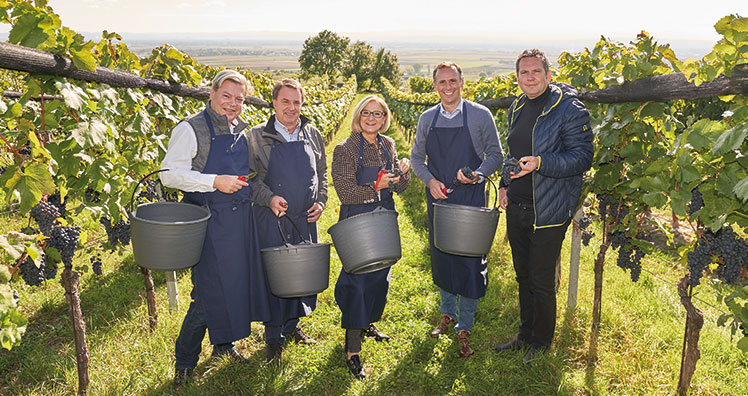Bei der Traubenernte für Julias Raabs Jubiläumswein aus dem Hause Anton Bauer aus Feuersbrunn packten Landeshauptfrau Johanna Mikl-Leitner, Wirtschaftslandesrat Jochen Danninger, Wirtschaftsbund Niederösterreich (WBNÖ) Landesobmann und Wirtschafskammer-Niederösterreich-Präsident Wolfgang Ecker und WBNÖ-Direktor Harald Servus mit an.