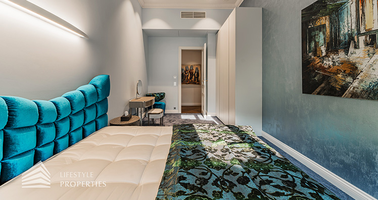 Neben einem Doppelbett aus blauem Samt finden Sie dort einen kleinen Schreibtisch, sowie einen geräumigen Schrank vor. Im dritten Zimmer finden Sie ein hochwertiges Sofa, einen Schreibtisch und einen Kleiderschrank vor. Die beiden dazugehörigen Bäder sind mit einer geräumigen Glasdusche, sowie einer Toilette ausgestattet. Die hochwertigen, verzierten Fliesen geben den Bädern ein ganz besonderes Flair.