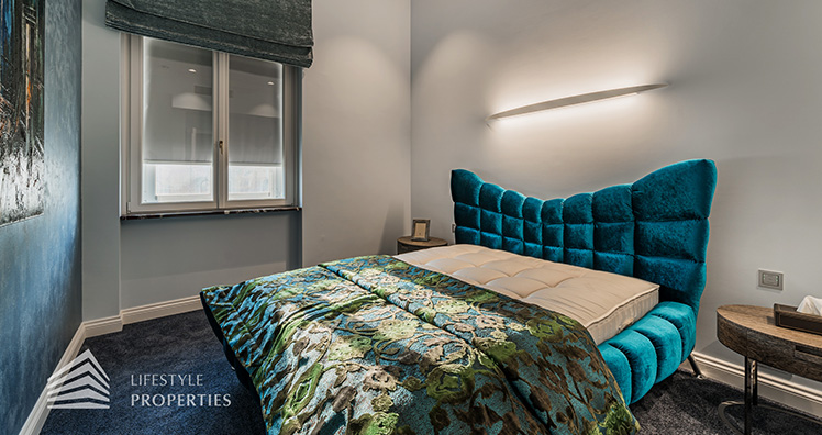 Der Raum verfügt über ein luxuriöses Doppelbett aus violettem Samt und einen Kleiderschrank. Das ca. 9,16 m² große Badezimmer ist mit einer großen, bodenebenen Dusche, einer Badewanne, einer Toilette, sowie einem Bidet ausgestattet. Das etwas größere der beiden Zimmer ist in wunderschönen Blautönen gehalten und mit einem gemütlichen Teppichboden ausgekleidet.