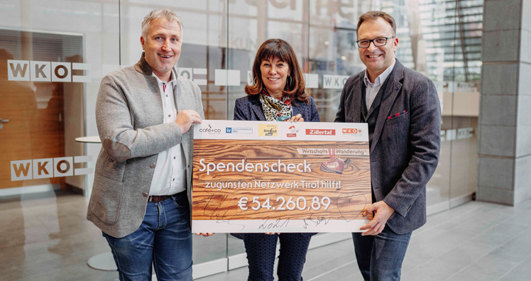 Die Summe kommt dem "Netzwerk Tirol hilft" zu Gute: einer Soforthilfeinitiative, die vom Tiroler Landeshauptmann Günther Platter ins Leben gerufen wurde und die unschuldig in Not geratenen Tiroler:innen mit rascher und unbürokratischer Hilfe zur Seite steht. Am 14. Dezember überreichte Café+co den Spendenscheck schließlich an Martha Schultz, WKÖ-Vizepräsidentin und Gastgeberin der Wirtschaftswanderung in Fügen stellvertretend an das „Netzwerk Tirol hilft".