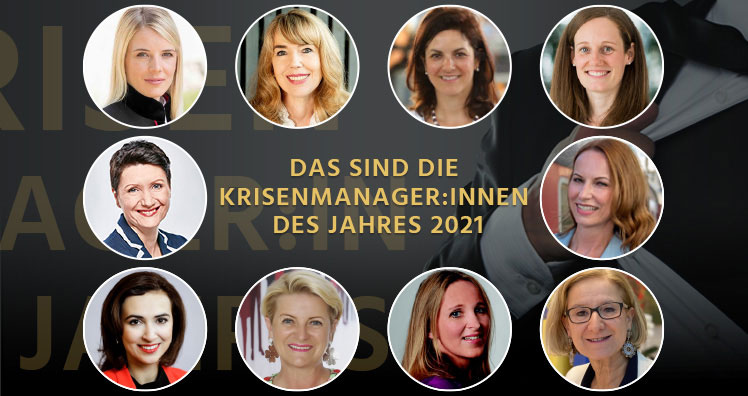 Die Krisenmanagerinnen des Jahres sind auf Platz 1 Viktoria Veider-Walser, Geschäftsführerin Kitzbühel Tourismus, auf Rang zwei folgt Eveline Pupeter, CEO Emporia Telecom, vor Susanne Baumann-Söllner, Direktorin des ACV, auf dem dritten Platz. Die Top 5 komplettieren Lisa Weddig, Geschäftsführerin Österreich Werbung, und Sandra Bauernfeind, CEO Heimat Österreich. Dahinter folgen Justizministerin Alma Zadic, Immobilienmaklerin Marlies Muhr, Manuela Bruck, Unternehmenskommunikation der Österreichischen Post, Landeshauptfrau Johanna Mikl-Leitner und Michaela Huber, Vorständin der ÖBB Personenverkehr AG.