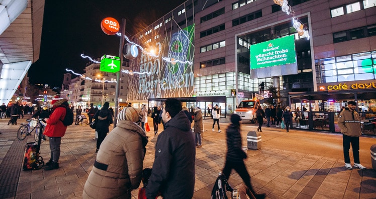 Laut den Projektverantwortlichen Walter Höss (Wallscreen-Eigentümer und -Vermarkter) und Fassaden-Vermarkter Vergim Bekirovski (Project B) können LED-Wall und Fassadenprojektion sowohl zusammen als auch einzeln gebucht werden. Gemeinsam ergeben die Flächen natürlich ein besonders eindrucksvolles Digital-Out-of-Home-Ensemble.