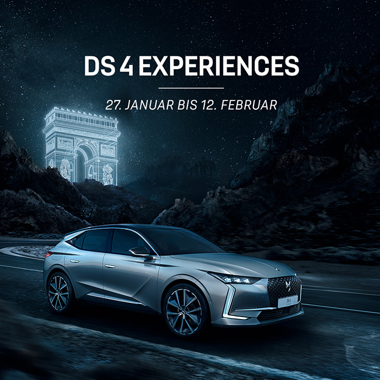 Lernen Sie während der DS 4 Experiences vom 27.01. bis 12.02.2022 den DS 4, den DS 4 E-TENSE – die Plug-In-Version – sowie weitere DS Modelle im Rahmen eines exklusiven Beratungstermins kennen.