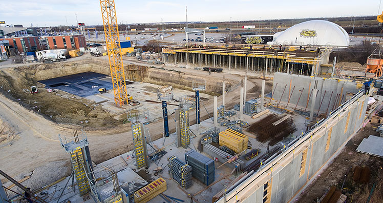 Jetzt geht’s Schlag auf Schlag: Das neue Bauzentrum der Blauen Lagune im Süden Wiens, selbst ein Showcase für nachhaltiges Bauen, wächst und wächst. Die fünf Ausstellungsgebäude werden nach einer ausgetüftelten Logistik errichtet, die den ungestörten Betrieb des bestehenden Fertighauszentrums gewährleistet. Die Kellerarbeiten sind bei allen Gebäuden so gut wie abgeschlossen, die Erdgeschoße für Showrooms werden nun Zug um Zug errichtet.