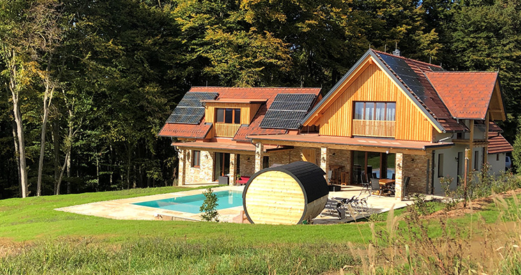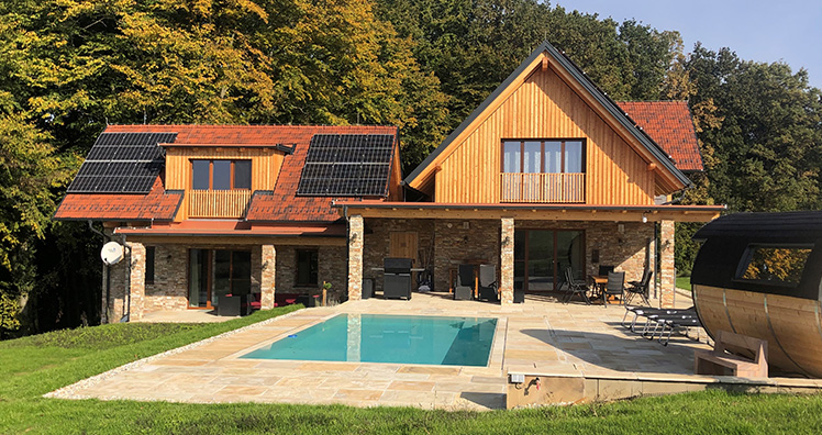 Wer jetzt denkt, dass hier auf Kosten der Umwelt und nicht nachhaltig gebaut wurde, irrt: Durch 50-iger Ziegel, viel Holz aus der Region, mehr als 800 m2 Naturstein, wurde versucht, energie-effizientes Urlauben zu ermöglichen: Durch die dicken Mauern benötigt man keine zusätzliche Dämmung und übererfüllt Passiv-Haus-Standards. Die Wärmepumpe für Pool und Heizung wird durch die hauseigene PV-Anlage gespeist, verbraucht somit wenig konventionellen Strom und durch die Nutzwasser-Anlage wird auf den ökologischen Fußabdruck geachtet. Und das Beste: Häuser wie diese sind im Regelfall erst mühsam durch lange Autoreisen, oder gar nur mit dem Flugzeug von Österreich aus erreichbar.