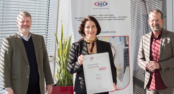Das BFI Wien darf sich auch weiterhin als familienfreundlicher Arbeitgeber bezeichnen. "Nicht erst seit Ausbruch der Pandemie ist die Vereinbarkeit von Beruf und Familie für viele unserer Kolleg:innen ein täglich absolvierter Spagat. Daher ist es uns schon seit jeher ein großes Anliegen familienfreundliche Rahmenbedingungen in unserem Unternehmen zu schaffen", kommentiert Franz-Josef Lackinger, Geschäftsführer BFI Wien, die neuerliche Zertifizierung des BFI Wien als familienfreundlicher Arbeitgeber im Zuge des staatlichen Audits "berufundfamilie".