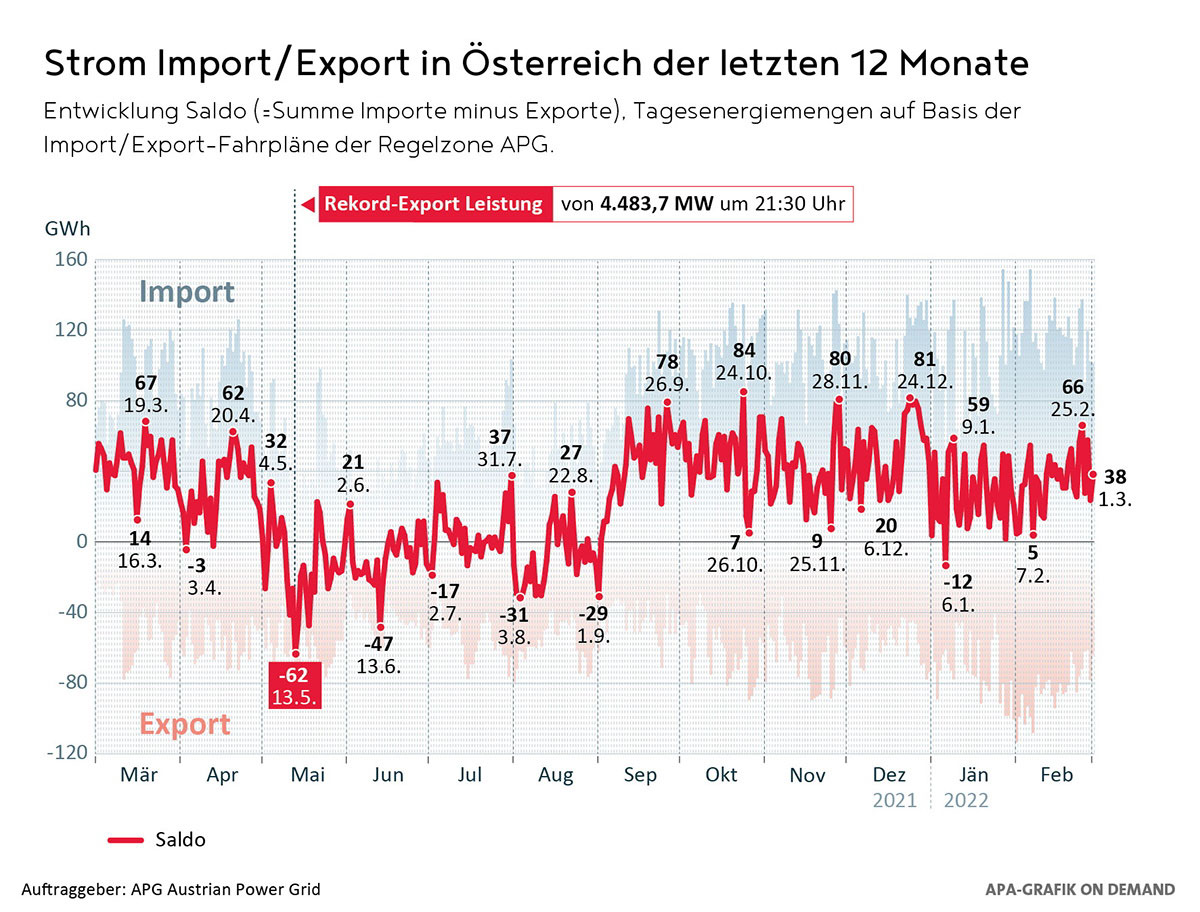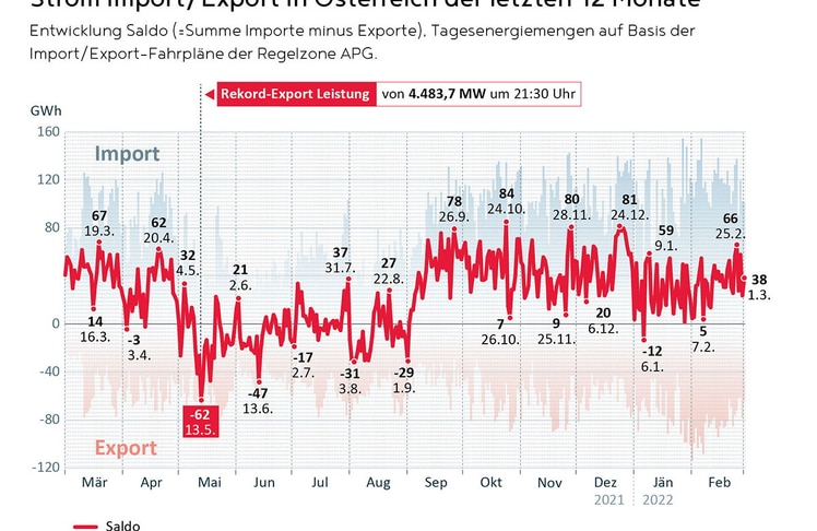 Trotz des guten Anteils an Windenergie musste im Februar bilanziell gesehen ausschließlich importiert werden. "Die Differenz zwischen jenem Anteil an der Strombedarfsdeckung aus nachhaltiger Energie und dem tatsächlichen Verbrauch muss mittels konventioneller Stromerzeugung und zugekauftem Strom kompensiert werden. Ein für die Wintermonate übliches Bild", sagt Thomas Karall, kaufmännischer Vorstand der APG. Im Februar wurden gesamt 977 GWh Strom importiert, das entspricht rund 12 Prozent mehr Stromimport als das im Vergleichsmonat des Vorjahres notwendig war. Der höchste Tagesimport lag am 25. Februar bei 66 GWh.