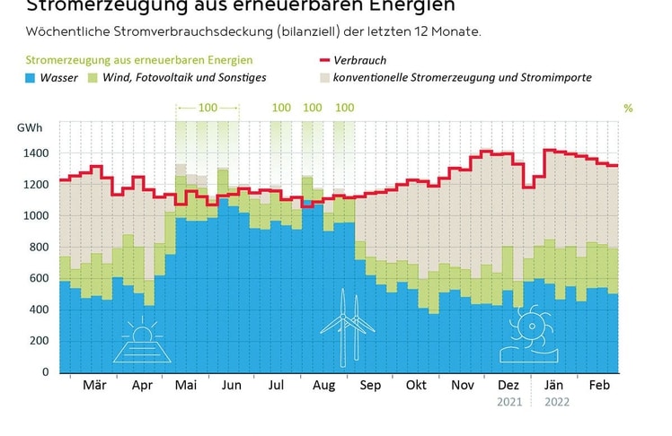 Österreichs Strombedarf betrug im zweiten Monat des Jahres (Kalenderwoche fünf bis acht) gesamt rund 5.380GWh. Mit einer wöchentlichen Schwankungsbreite von minus zwei bis plus ein Prozent, befand man sich somit annähernd auf dem durchschnittlichen Vergleichsniveau von 2017-2021. "Die gute Stromerzeugung durch Windkraft ist Grund dafür, dass im Februar rund 60 Prozent des heimischen Strombedarfs (das entspricht rund 3.170 GWh) nachhaltig gedeckt werden konnten", sagt Gerhard Christiner, technischer Vorstand der APG.