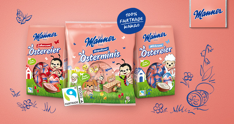 Was dieses Jahr zu Ostern auf keinen Fall fehlen darf? Die lieblichen Ostertiere von Manner natürlich! Hoppel, Fläumchen, Pünktchen und Wölkchen verzaubern auf den Manner Neapolitaner Osterminis mit einem verspielten Design und sorgen für viel Abwechslung im Nesterl. Mit der Unterstützung der Ostertiere lässt sich heuer jedes Versteck finden. In sämtlichen Produkten mit Kakao weist das Fairtrade Cocoa Siegel auf den nachhaltigen Einkauf hin.