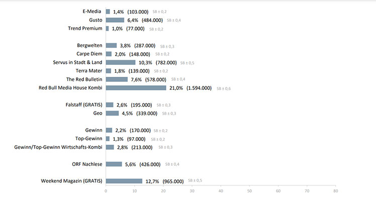 Die Kleine Zeitung erzielt in ihrem Hauptverbreitungsgebiet Kärnten und der Steiermark eine Reichweite von 40,3 Prozent: Das entspricht 627.000 Personen, die täglich die Nachrichten der Kleine Zeitung Redaktion lesen. Die Salzburger Nachrichten kommen auf 3,1 nach 3,0 Prozent.
