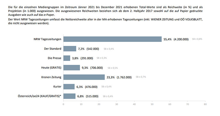 Im Jahr 2021 wurden für die Media Analyse 15.117 Interviews im Zeitraum Jänner bis Dezember durchgeführt, diese bilden die Basis des Jahresberichtes der ARGE Media-Analysen. Jeder Zweite (genauer: 55,4 Prozent) greift österreichweit jeden Tag zu einer Tageszeitung.