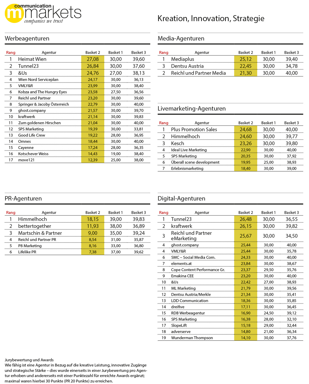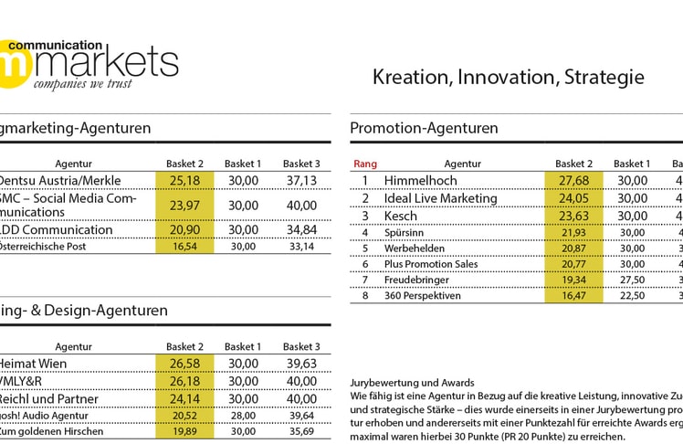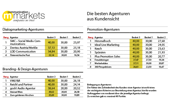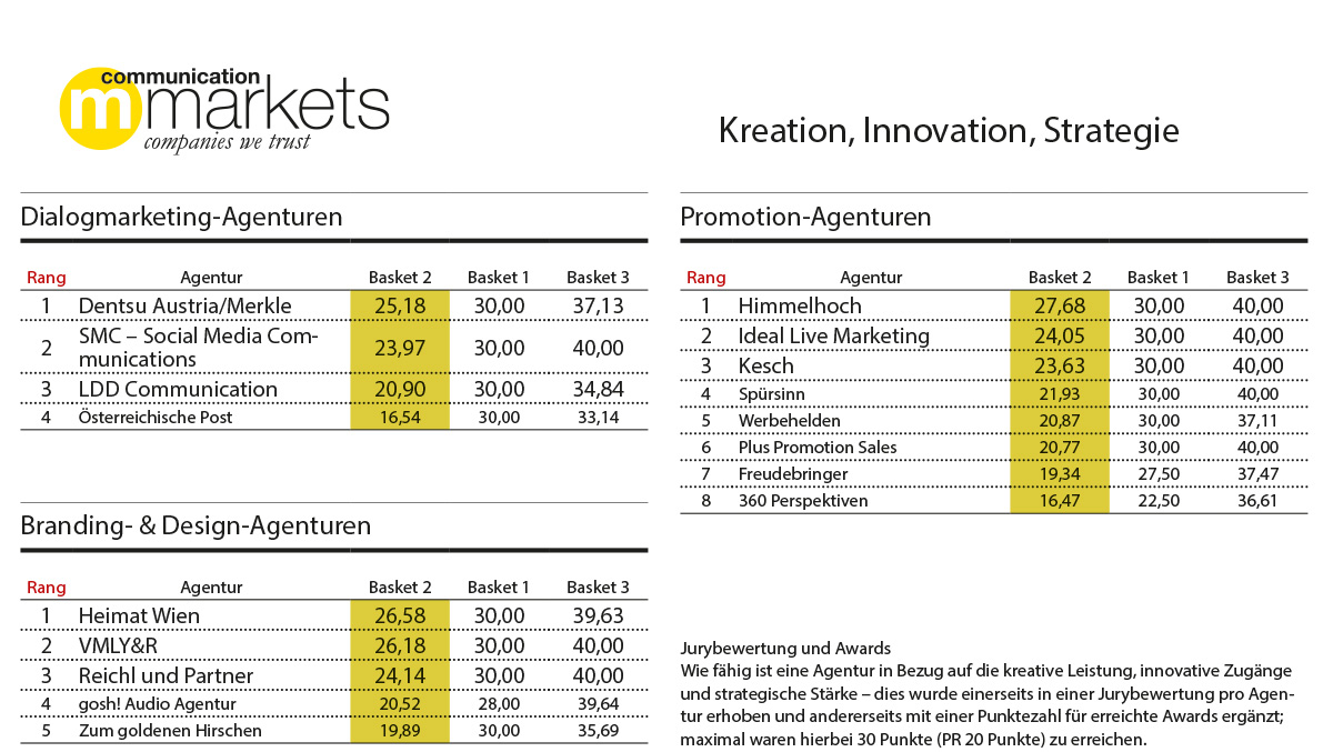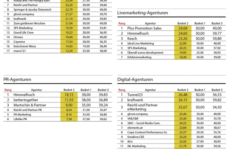 Dabei wurde Himmelhoch nicht nur erneut zur besten PR-Agentur des Landes gekürt, sondern auch zur besten Promotion-Agentur. Mit einer Gesamtpunkteanzahl von 97,68 konnte die Agentur in dieser Kategorie sogar die Höchstwertung des gesamten Abends erzielen. Eine dritte, silberne Trophäe ging im Bereich Live Marketing an die vielfach ausgezeichnete Agentur Himmelhoch. Die Bewertungsgrundlage für die Preisverleihung bildeten auch in diesem Jahr, neben Daten und Fakten zum Unternehmen, anonymes Kundenfeedback und das Urteil einer hochkarätigen, 140-köpfigen Jury.
