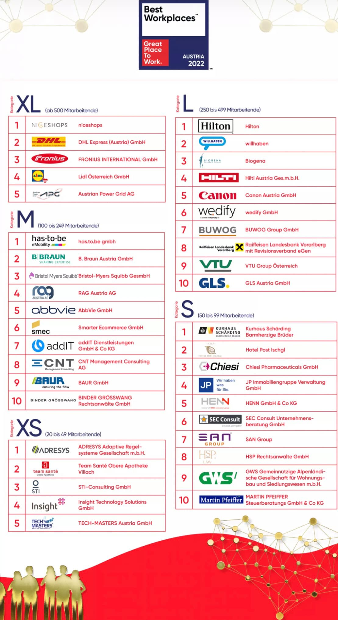 "Wir sehen alljährlich die Freude und den Stolz von Vorständen, Geschäftsführungen und Führungskräften, wenn sie das Feedback ihrer Mitarbeiter:innen erhalten und damit zum Great Place to Work zertifiziert werden. Dieses Feedback ist menschlich großartig und macht Unternehmen wirtschaftlich erfolgreich. So kann auch diese Zeit der Komplexität beantwortet werden", freut sich Doris Palz, Managing Director von Great Place to Work® Österreich mit den Siegerunternehmen. (red)