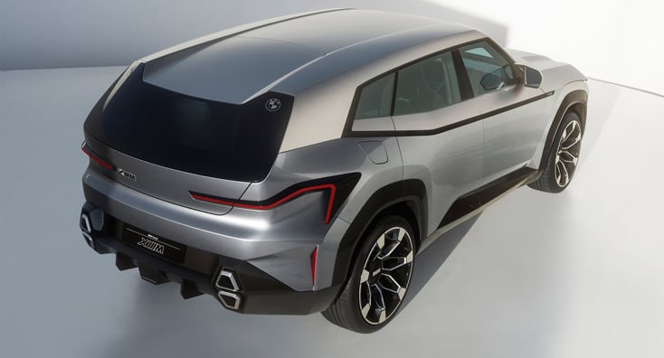 Am Heck beschreitet der Concept XM ebenfalls neue Wege. Hier markiert eigentlich die Scheibe das Highlight. Zum einen ist sie fast fugenlos in die Heckpartie eingesetzt, zum anderen sind in die Heckscheibe zwei BMW-Logos gelasert, die sich jeweils unterhalb der beiden Dachholme befinden. Diese Besonderheit kann man durchaus als Hommage an den legendären M1 sehen, bei dem es sich nach wie vor um das bis heute einzige eigenständig entwickelte Modell der M GmbH handelt. Im unteren Bereich der Heckansicht sorgen die weit ausgestellten Radhäuser für einen kraftvollen Stand. Dieser wird auch durch die schmalen Heckleuchten in markentypischer L-Form unterstrichen, die sich nahezu über die gesamte Breite des Hecks ziehen. In der Heckschürze dominieren die markanten Doppelendrohre der Abgasanlage, die sowohl zweibordig als auch zweiflutig geführt ist.