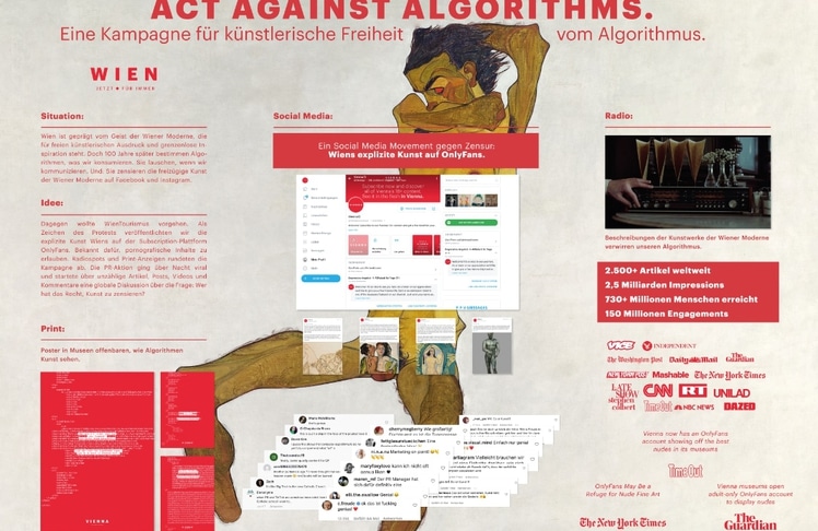 Für Jung von Matt Donau regnet es Gold-Trophäen. Gleich fünfmal kann Jung von Matt Donau die Jury mit ausgezeichneter Kreativarbeit überzeugen: In der Kategorie "Gesamtkampagne" überzeugt die Agentur mit "Act Against Algorithms. Ein Protest Movement für künstlerische Freiheit auf OnlyFans." für Wien Tourismus. Als Teil dieser Kampagne überzeugt "Vienna strips on OnlyFans." in den Kategorien PR Aktion und Social Media. Gold gibt es auch in der Kategorie "OOH Klassische Werbeformen" für die Kampagne "Bin ich die Caritas?" für Caritas Österreich. Mit "Raus aus Öl und Gas" für das Bundesministerium für Klimaschutz überzeugt Jung von Matt Donau in der Kategorie "Film, TV- & Kinospots". Für den Goldregen verdient sich der Spitzenreiter unter den Gewinnern schließlich auch die sechste Gold-Auszeichnung in der Kategorie "Creative Lead of the Year".
