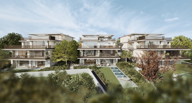 Die drei Villen werden ebenso viele verschiedene Wohnungstypen beherbergen: Die Garden Residences, die Chipperfield Apartments und The Penthouses – in drei unterschiedlichen Stilen, die dementsprechend drei unterschiedliche Käufergruppen ansprechen sollen. Auf vier Stockwerken versammeln sich gesamt 20 Apartments mit zwischen 30 und 300 Quadratmetern und ein bis acht Zimmern, gepaart mit einem speziellen Gartenkonzept.