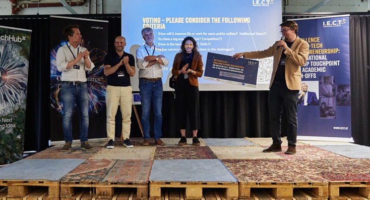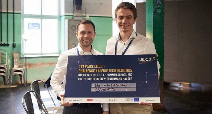 Bavertis war auch jenes Start-up, welches beim Publikumsvoting die meisten der anwesenden Expert:innen überzeugen konnte und damit als Sieger der I.E.C.T. – Challenge hervorging. Die beiden Co-Gründer Niclas Lehnert und Lukas Obkircher können sich über einen Tagespass für die I.E.C.T. – Summer School, sowie über eine One-on-One Session mit Hermann Hauser freuen.