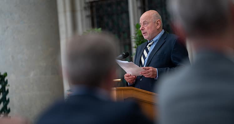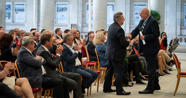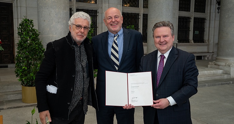 Worte der Anerkennung hielt im Rahmen des Festaktes der Universalkünstler André Heller, ein Freund Hirschmanns seit vier Jahrzehnten. Für ihn sei der Geehrte immer "a Mensch" gewesen, der als Freund und Journalist stets Haltung bewiesen habe. Und er verriet dem Geehrten: Künftig könne er durch ein eigenes Professoren-Tor in den Himmel gelangen – "durchs 'Prof.-Heinz-Conrads-Tor'".
