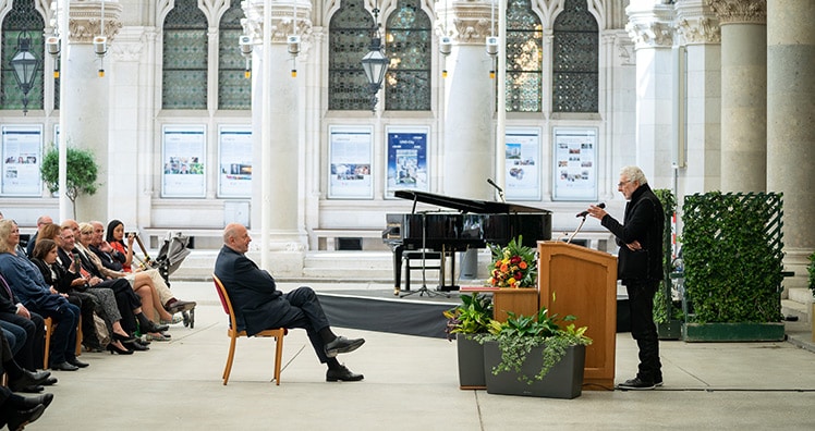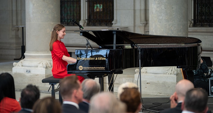 Für die musikalische Umrahmung der Feier sorgte die Musikerin Alma Deutscher, die am Klavier drei Eigenkompositionen spielte. Die seit Kurzem in Wien lebende 17-jährige Pianistin, Geigerin, Dirigentin und Komponistin gilt als Weltstar der Youtube- und TikTok-Generation. (ca)