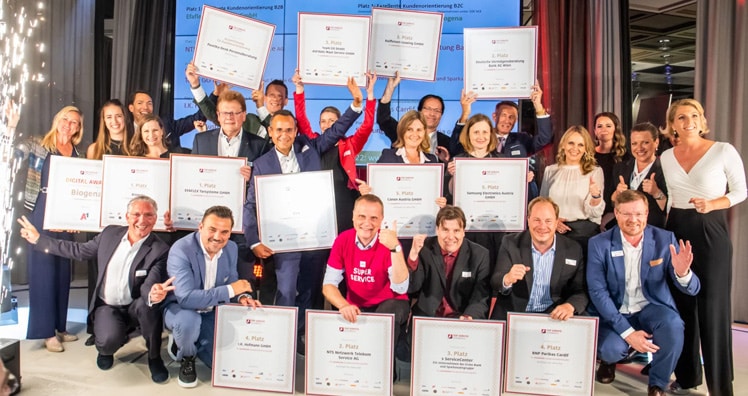 Die Laudatios auf die Top 3 Unternehmen für B2C und B2B hielten Nicole Plein, NAVAX; Nina Kaiser, ProsiebenSat.1Puls4; Natascha Kantauer-Gansch, A1; Michael Köttritsch, Die Presse; Paul Leitenmüller, Opinion Leaders Network; Gerhard Raffling, Medallia; Elke Schaffer, A1 sowie Ralf Schweighöfer, DHL Express Austria.