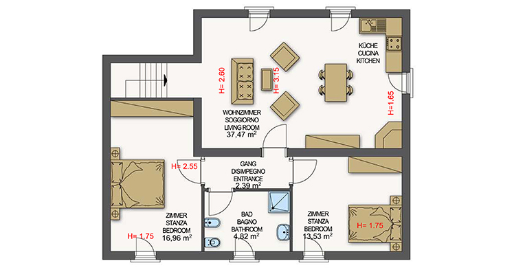 3.Stock: Wohnraum mit offenem Kamin und Küche, 2 Schlafzimmer, ein Bad mit Dusche/WC