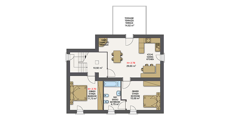 2.Stock: Wohnraum mit offenem Kamin und Küche, 2 Schlafzimmer, ein Bad, großzügige Terrasse