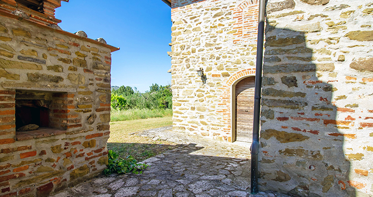 Das Anwesen, uneingesehen von Nachbarn, ist durch einen eigenen Tiefenbrunnen versorgt, ist aber überdies auch an das öffentliche Wasser- und Stromnetz angeschlossen. In einem Nebengebäude befindet sich ein gemauerter Backofen und das Herz der Zentralheizung. Das ganze Grundstück ist ca. 8.400 Quadratmeter groß und verfügt über eigene Olivenhaine und verschiedene Obstbäume wie Mandeln, Aprikosen, Äpfel, Birnen, Feigen und Granatäpfel.