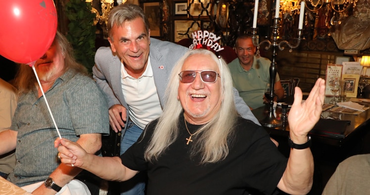 Nach Eierschwammerl Gulasch, Backhenderl und Bauernenten wurde eine große Nougat-Erdbeer-Schoko-Jubiläumstorte aufgefahren. Dass neben dem goldenen 50er noch 75 Kerzen auf der Torte erstrahlten und der gesamte Tross ein Happy Birthday für ihren Chef sang, ließ Mick Box, der vor wenigen Tagen seinen 75er feierte, die eine und andere Freudenträne verdrücken.