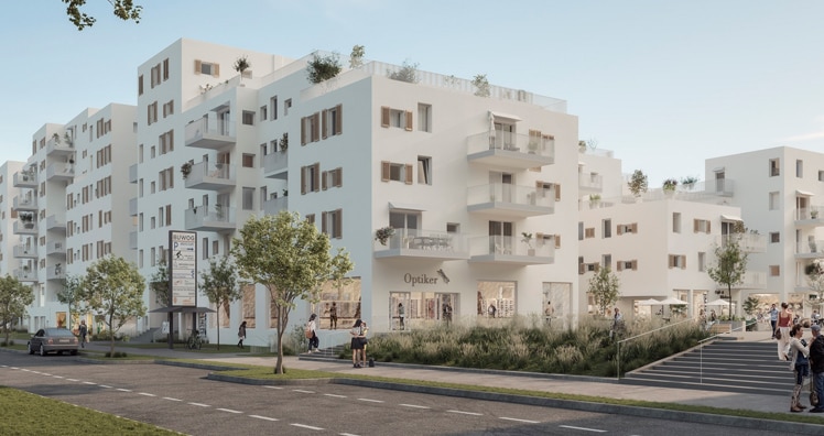 Im kommenden Jahr sollen die knapp 300 freifinanzierten Mietwohnungen in Rivus Vivere an ihre neuen Bewohner:innen übergeben werden. Die Wohnungen bieten mit Flächen zwischen 33 und 111 Quadratmetern, verteilt auf ein bis vier Zimmer, Raum für Singles, Paare oder Familien. Die Miete hängt von der Wohnungsgröße und -lage ab. Aber auch für Handelsunternehmen, Dienstleistungsbetriebe und Gesundheitseinrichtungen entsteht hier ein Areal. Die Wärmeversorgung der Wohnungen erfolgt über eine Kombination aus Gas und Wärmepumpen. Für die Stromversorgung gibt es eine Photovoltaikanlage. Zudem stehen 60 Tiefgaragenstellplätze für Gewerbeflächen zur Verfügung.