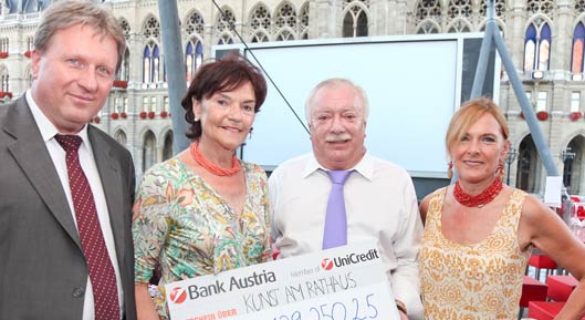 die Rathausfenster im ersten Stock zur leuchtenden Kunstgalerie machen. Unter der Patronanz von Wirtschaftspartnern, die die Kunstwerke erwerben, kommt der Erlös hilfsbedürftigen Kindern und Familien in Österreich zugute. "Mit der Aktion will die Stadt Wien gemeinsam mit Kunst und Wirtschaft ein sichtbares Zeichen für Solidarität und Nächstenliebe setzen", so Bürgermeister Michael Häupl bei der Übergabe des Spendenschecks.