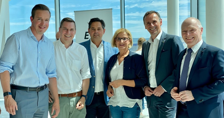 Mit dabei waren: Landeshauptfrau Johanna Mikl-Leitner, Landesrat Jochen Danninger, Matthias Förster (Leitung Vertriebsstrategie & Digitalisierung bei der Hypo NOE), Andrea Edelmann (Head of Innovation, Sustainability & Environmental Affairs bei der EVN Group), die LAbg. Bernard Heinreichsberger und Christoph Kaufmann, Lukas Reutterer (Geschäftsführer ecoplus digital und künftiger Leiter des Haus der Digtialisierung), Peter Erlacher, FH Wiener Neustadt, sowie Helmut Miernicki (Geschäftsführer ecoplus).