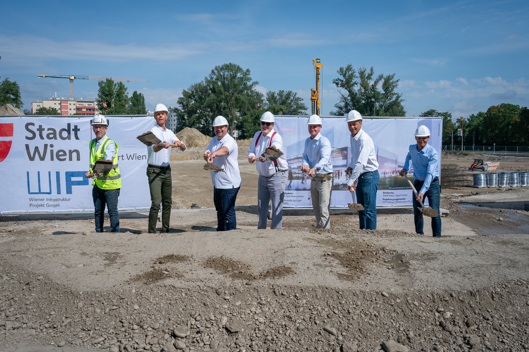 Sportstadtrat Peter Hacker, Bezirksvorsteher Alexander Nikolai, der Leiter der MA 51 – Sport Wien, Anatol Richter, und Wien Holding-Geschäftsführer Oliver Stribl griffen am Mittwoch zum Spaten und gaben den Startschuss für den Bau der neuen Sportanlage. Diese wird rund 13.000 Quadratmeter Sportfläche bieten und ab 2025 in den Voll-Betrieb gehen.