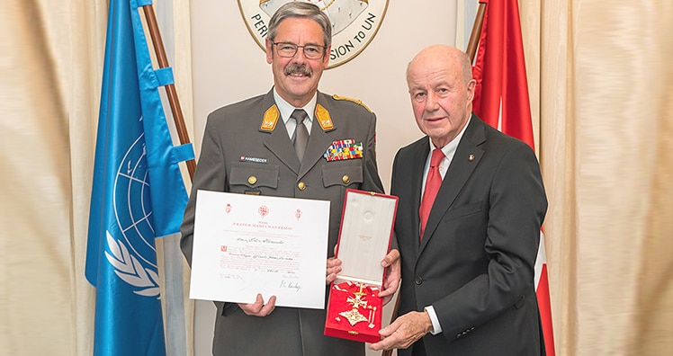 Seit einigen Monaten ist Erwin Hameseder Generalanwalt der Raiffeisen-Verbandes (LEADERSNET berichtete). Nun wurde der Generalmajor mit der höchsten militärischen Auszeichnung des Souveränen Malteserordens geehrt. Botschafter Günther Granser, ständiger Vertreter des Ordens bei den Vereinten Nationen, IAEA und UNIDO, lud zum Empfang anlässlich der Ordensüberreichung an den Milizbeauftragten des Österreichischen Bundesheers und Generalanwalt der Raiffeisen-Verbandes.