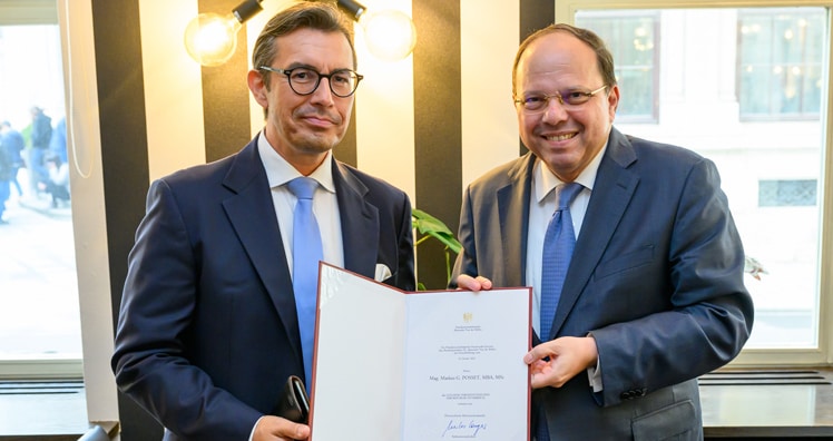 Markus Posset erhielt am Montagnachmittag das "Goldene Verdienstzeichen der Republik Österreich" seitens der Bundesministerin Susanne Raab im Bundeskanzleramt offiziell verliehen. Danach lud er Freund:innen, Wegbegleiter:innen und Geschäftspartner:innen zum Cocktailempfang in das Radison Blue Hotel in die Herrengasse ein.