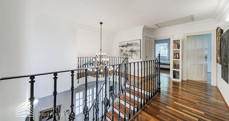 An den Wohnraum anschließend befindet sich ein Büroraum. Über den Eingangsbereich erreichen Sie ebenso ein Gästezimmer sowie ein in Marmoroptik gehaltenes Gästebad. Der schöne Treppenaufgang führt Sie in die Galerie im ersten Stock, von wo aus die 3 Zimmer, ein Schrankraum, ein Badezimmer und ein WC zentral begehbar sind. Das ca. 14 m² große Hauptschlafzimmer verfügt über eine eigene Terrasse mit Fernblick ins Grüne. Die weiteren Zimmer mit Flächen von ca. 10-12 m² eignen sich ideal als Büro, Kinder- oder Gästezimmer. Einer der Räume ist momentan als Ankleide mit angrenzendem Waschraum eingerichtet. Das Bad lässt mit Whirlpool-Badewanne, Dusche und zwei Waschbecken keine Wünsche offen.