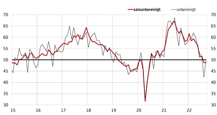 Die Talfahrt der österreichischen Industrie setzte sich Ende des dritten Quartals 2022 fort. "Der UniCredit Bank Austria EinkaufsManagerIndex erreichte im September erneut 48,8 Punkte. Damit lag der Indikator den zweiten Monat in Folge unterhalb der Wachstumsschwelle von 50 Punkten, signalisierte gegenüber dem Vormonat aber zumindest vorerst keine weitere Beschleunigung der Konjunktureintrübung", meint UniCredit Bank Austria Chefökonom Stefan Bruckbauer.