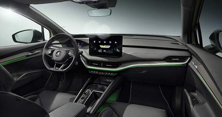 Für das Top-Modell ENYAQ COUPÉ RS iV stehen zwei exklusive Design Selections zur Auswahl. Zum Serienumfang gehören Dekorleisten im Carbon-Look an Instrumententafel und Türverkleidungen sowie Pedalabdeckungen im Aluminium-Design und Sportsitze mit integrierten Kopfstützen, die ein RS-Logo tragen.