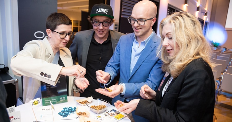 Im Vorfeld zur Keynote gab es einige Kostproben – vom Proteinriegel bis zu den Zirp-Snacks "Heimchen Smoked" und "Mehlwürmer natur". Was viele Gäste zu Beginn noch nicht sofort als Appetizer testen wollten, war für einige nach dem Vortrag kein Problem mehr. Die Gastgeber von enteco sprangen in die Vorbildrolle und testeten sich auf der Bühne durch die mitgebrachten Speisen. Im Anschluss unterhielten sich die Gäste bei Gin aus österreichischer Produktion und Insekten-Snacks zu diesem Thema.