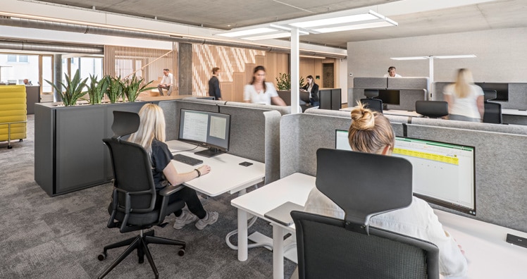 Hauptaufgabe der Planer:innen war es, für die rund 100 Mitarbeiter:innen eine moderne Arbeitsumgebung zu erschaffen. Das Ergebnis ist eine Arbeitswelt, die in Bereiche gegliedert ist, die Raum für die verschiedenen Tätigkeiten schaffen. Diverse Zonen sind unterschiedlichen Aufgaben gewidmet und können von allen Mitarbeiter:innen genutzt werden. Dadurch ist es möglich, dass die Mitarbeiter:innen am neuen Standort abteilungsübergreifend zusammenarbeiten – ohne Wände, im Open Space.