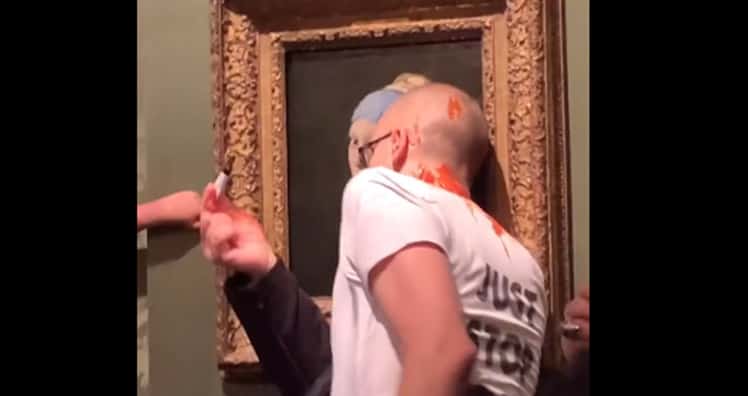 Einer der Männer klebte seinen Kopf am Schutzglas des Gemäldes fest und überschüttete sich dann mit einer roten Flüssigkeit. Die drei Aktivisten wurden festgenommen.