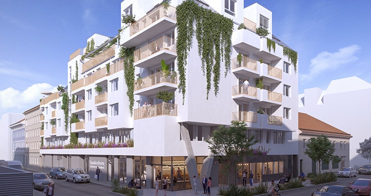 Darüber hinaus sind ein dreigruppiger Kindergarten der Nikolausstiftung, Büros, Ordinationen sowie eine weitere Gewerbeeinheit auf einer Gesamtnutzfläche von 1.996 Quadratmetern vorgesehen sowie großzügig bepflanzte Freibereiche, ein Gemeinschaftsraum mit Küche und ein Dachgarten zur Allgemeinnutzung. Für die ambitionierte Architektur aus geschichteten und dreidimensional miteinander verbundenen Baukörpern inklusive begrünter Fassade zeichnen die Architekten der t-hoch-n ZT GmbH verantwortlich.